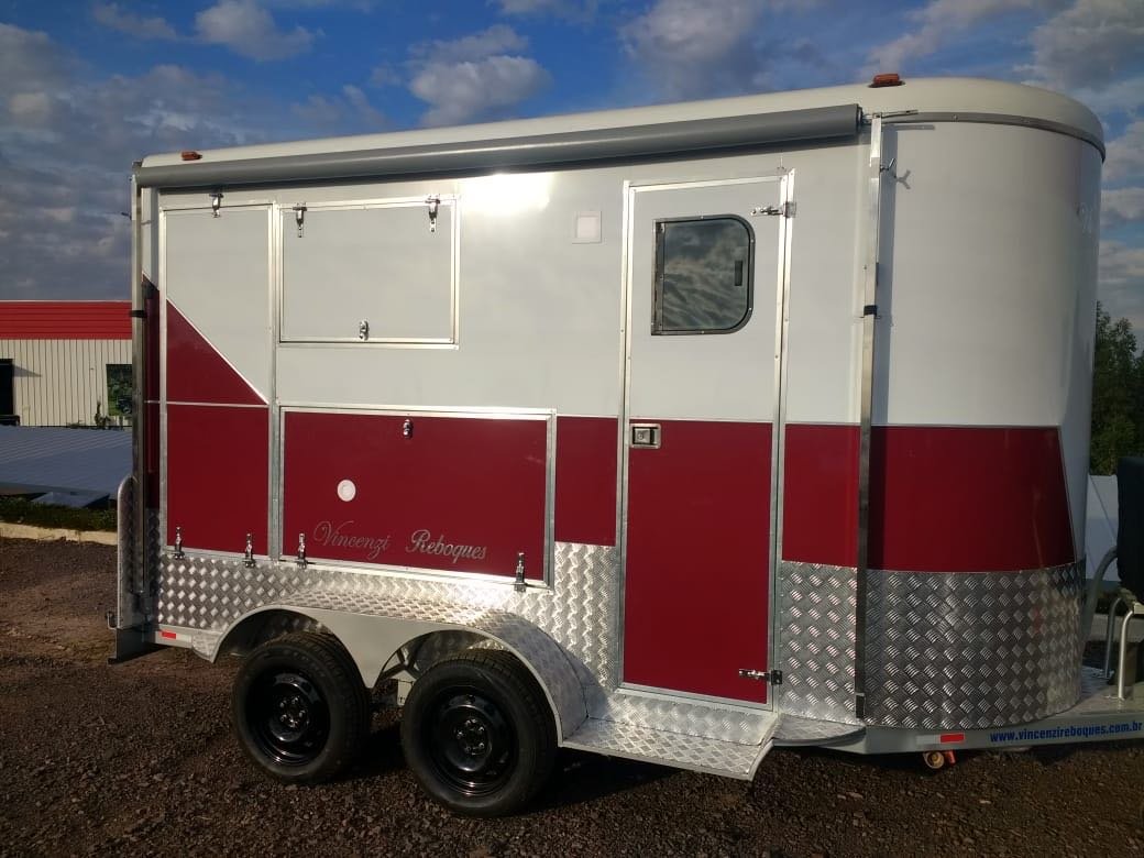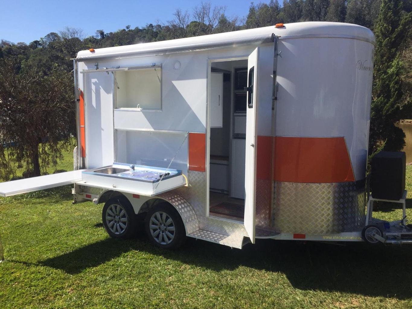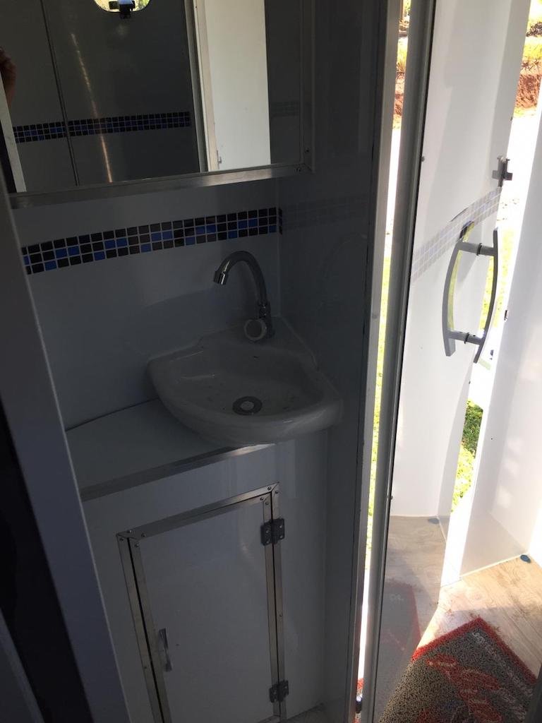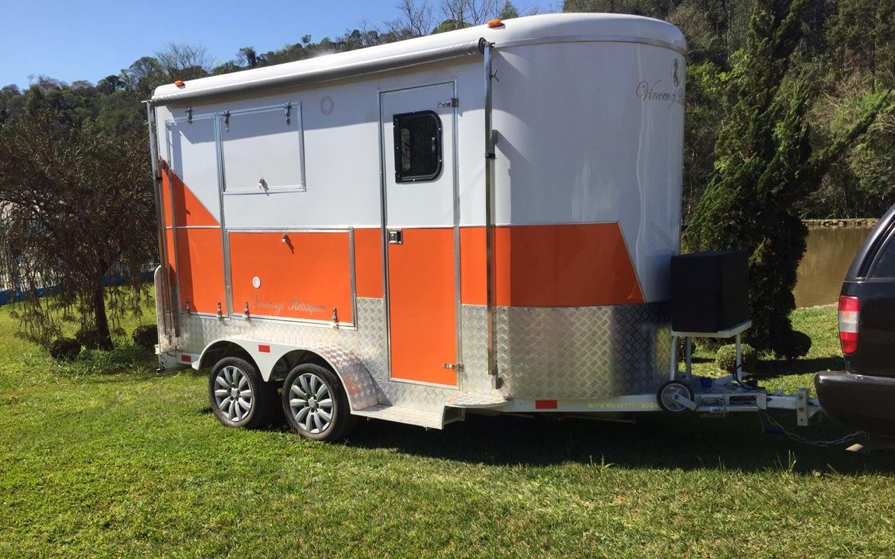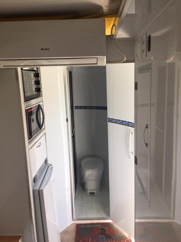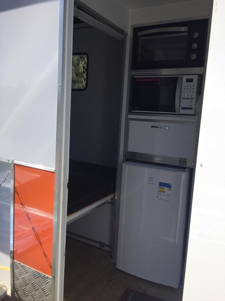 | Medidas externas 4,00 x 1,60 x 2,00 Chassi 100 x 40 x 15 x 3,00 Revestimento interno externo Alumínio Assoalho Compensado naval revestido com lâminas de PVC teto em Fibra Regulagem de Altura Na Ponteira Ponteira Reforçada Para 2500kg Freio Hidráulico nas 04 rodas Freio Estacionário Suspensão com feixe de molas e balancim Rodas Aro 15 Pneus novos Estepe 01 pneu novo Para-lamas duplo em alumínio Estrutura perfil dobrado Chuveiro Elétrico Vaso Sanitário Importado econômico Depósito de Água de 140 litros Depósito de dejetos de 140 litros Iluminação interna e externa em LED Espera para Micro-ondas Espera para forno elétrico Espera para frigobar Espera para geladeira Pia na banheira Pia externa embutida Espera de TV embutida Mesa lateral embutida | OPCIONAIS- Toldo Mecânico (Unidade)