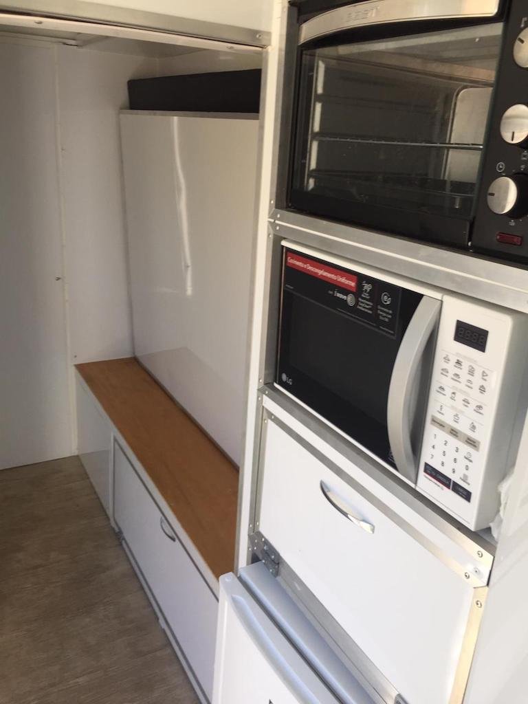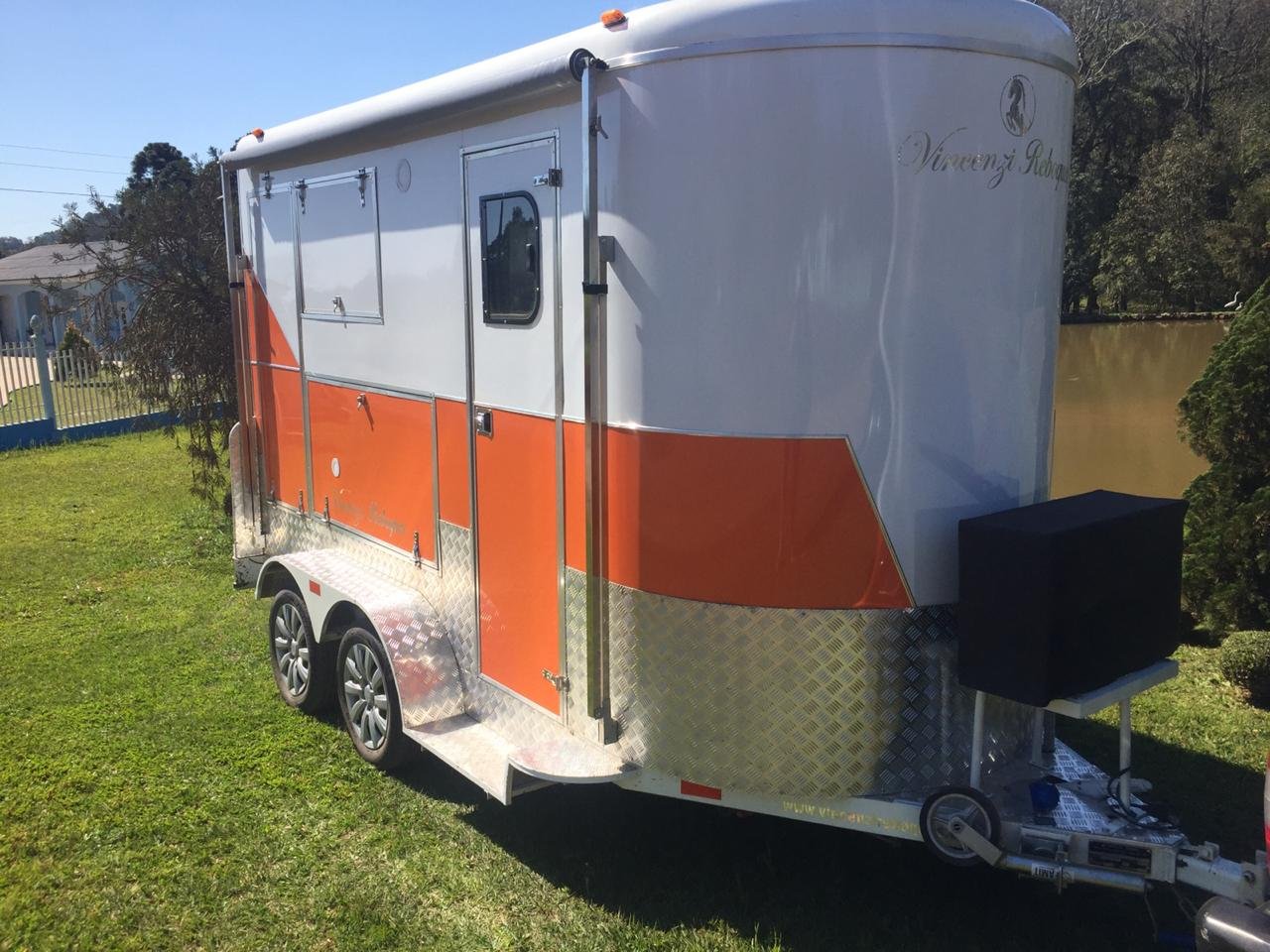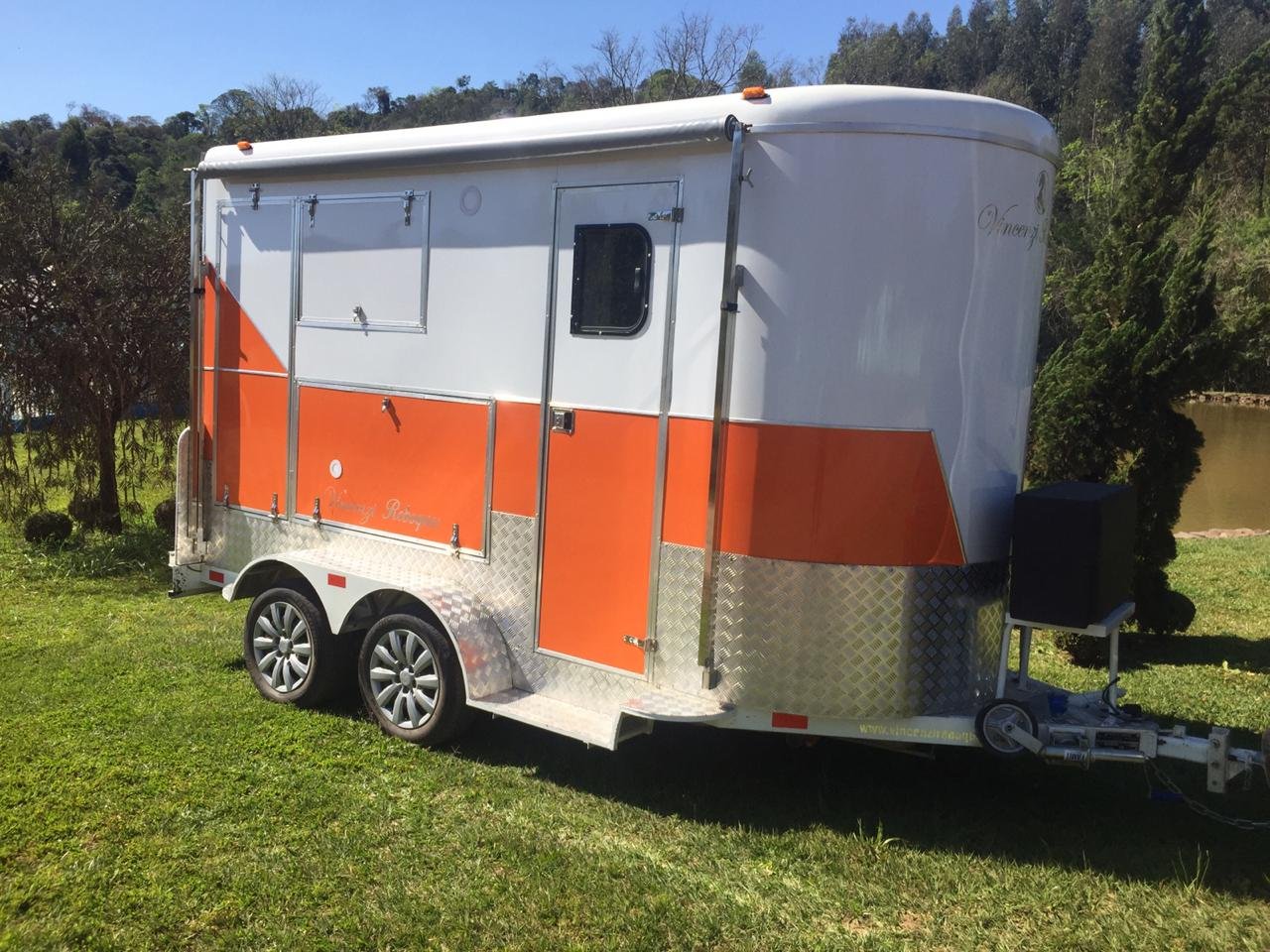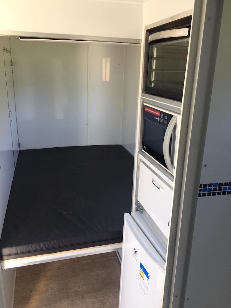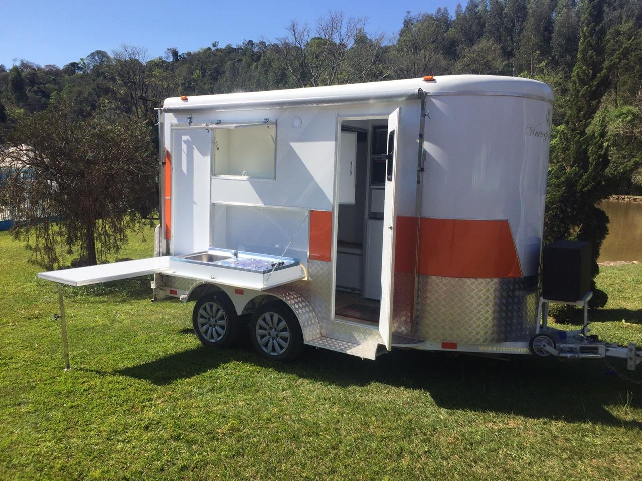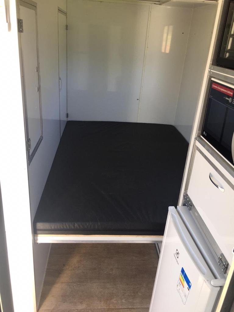 | Medidas externas 4,00 x 1,60 x 2,00 Chassi 100 x 40 x 15 x 3,00 Revestimento interno externo Alumínio Assoalho Compensado naval revestido com lâminas de PVC teto em Fibra Regulagem de Altura Na Ponteira Ponteira Reforçada Para 2500kg Freio Hidráulico nas 04 rodas Freio Estacionário Suspensão com feixe de molas e balancim Rodas Aro 15 Pneus novos Estepe 01 pneu novo Para-lamas duplo em alumínio Estrutura perfil dobrado Chuveiro Elétrico Vaso Sanitário Importado econômico Depósito de Água de 140 litros Depósito de dejetos de 140 litros Iluminação interna e externa em LED Espera para Micro-ondas Espera para forno elétrico Espera para frigobar Espera para geladeira Pia na banheira Pia externa embutida Espera de TV embutida Mesa lateral embutida | OPCIONAIS- Toldo Mecânico (Unidade)