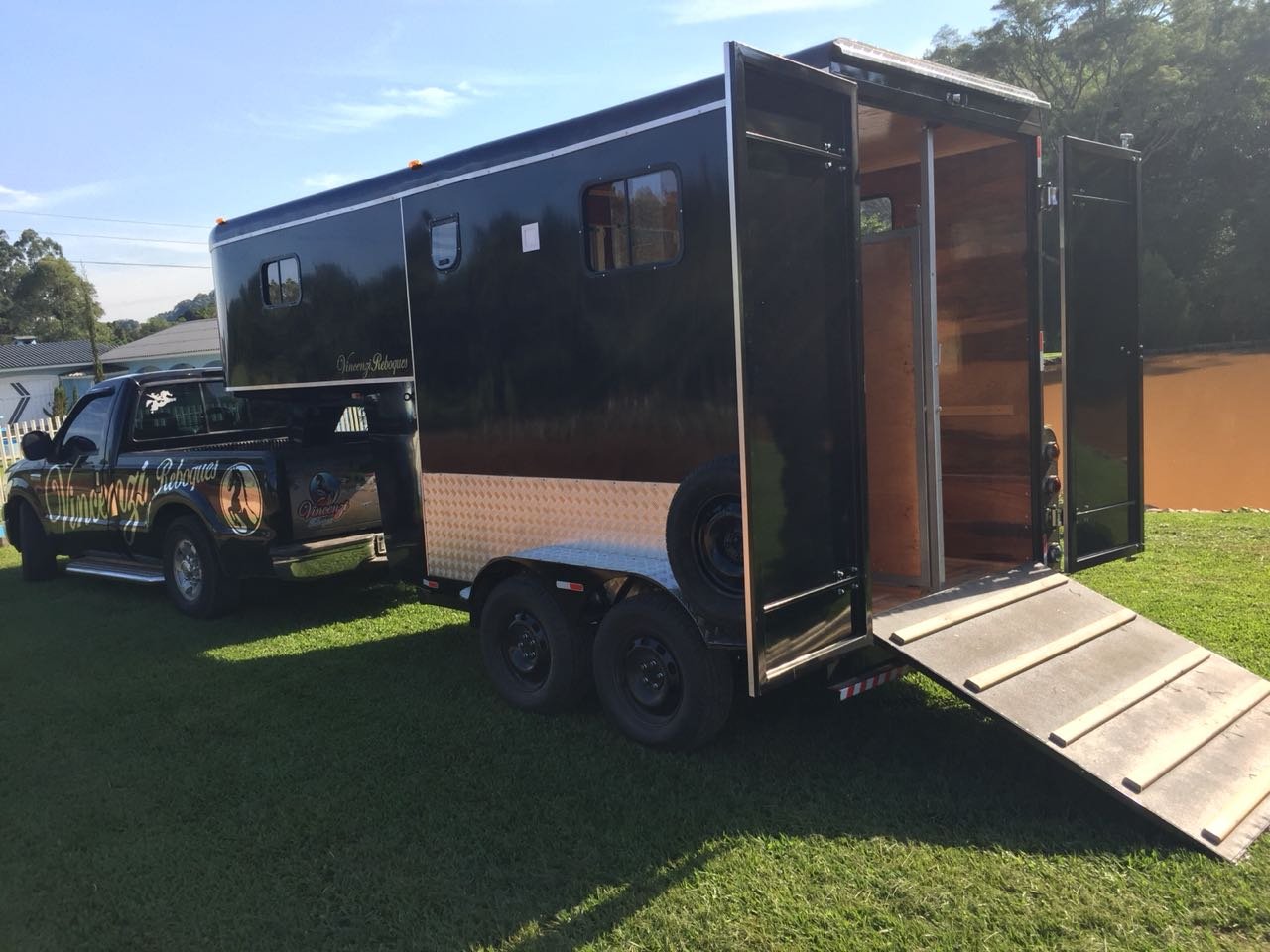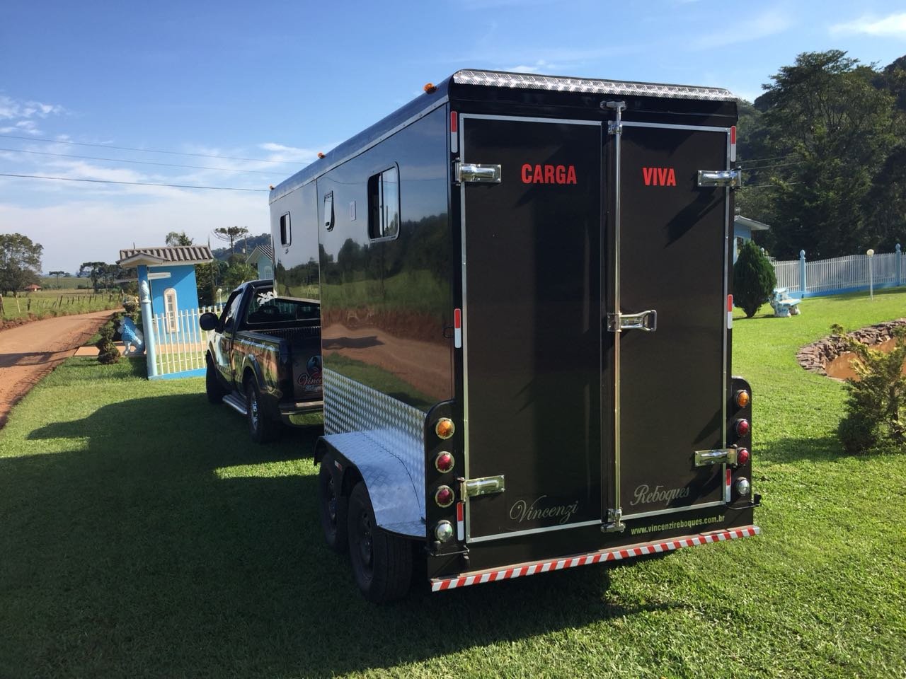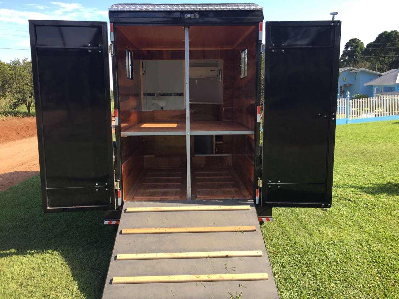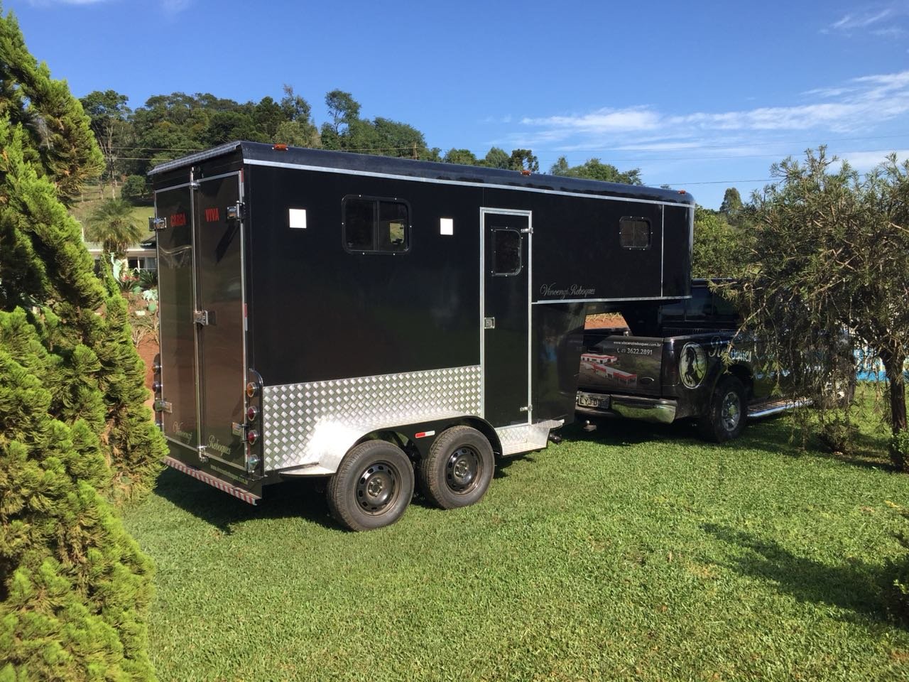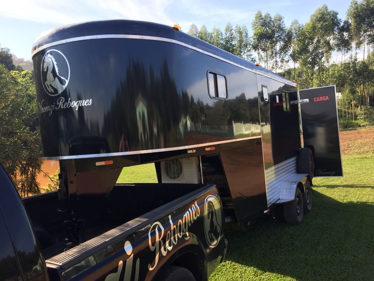 | Medidas externas 6,00 x 1,60 x 2,00 Chassi 100 x 40 x 15 x 3mm Para 02 cavalos Revestimento externo e interno Alumínio Teto em Fibra Freio Hidráulico nas 04 rodas Corrente de Segurança para o engate Assoalho e rampa Madeira beneficiada Ripas Antiderrapante Iluminação interna e externa em LED Porta Traseira Com dobradiça em inox Quarto de casal c/ armários Escada para subir na cama Bagageiro Interno Pessoal Banheiro revestido Em Alumínio Chuveiro Elétrico Vaso Importado econômico Pia no banheiro Bomba automática Schurfflo Depósito de Água de 120 litros Depósito de dejetos de 120 litros Amortecedores Suspensão Com Balancim Feixe de molas com 07 lâminas Rodas Aro 15/205/70 Pneus novos Estepe pneu novos Estrutura em perfil dobrado Espera para Frigobar Cavaleira em compensado naval | OPCIONAIS